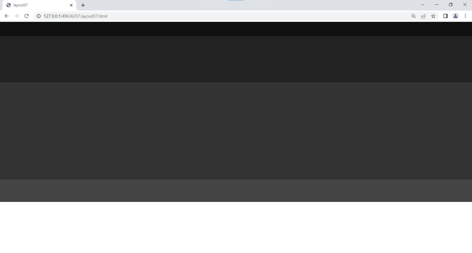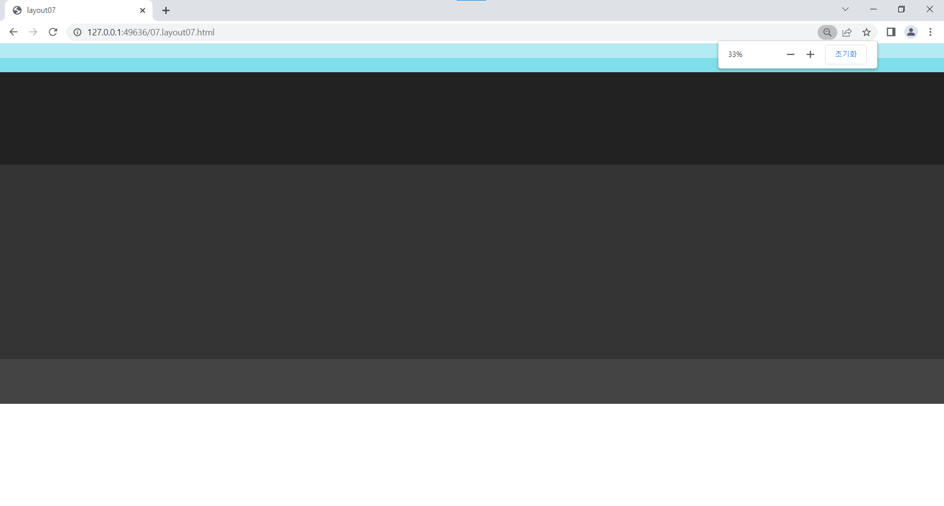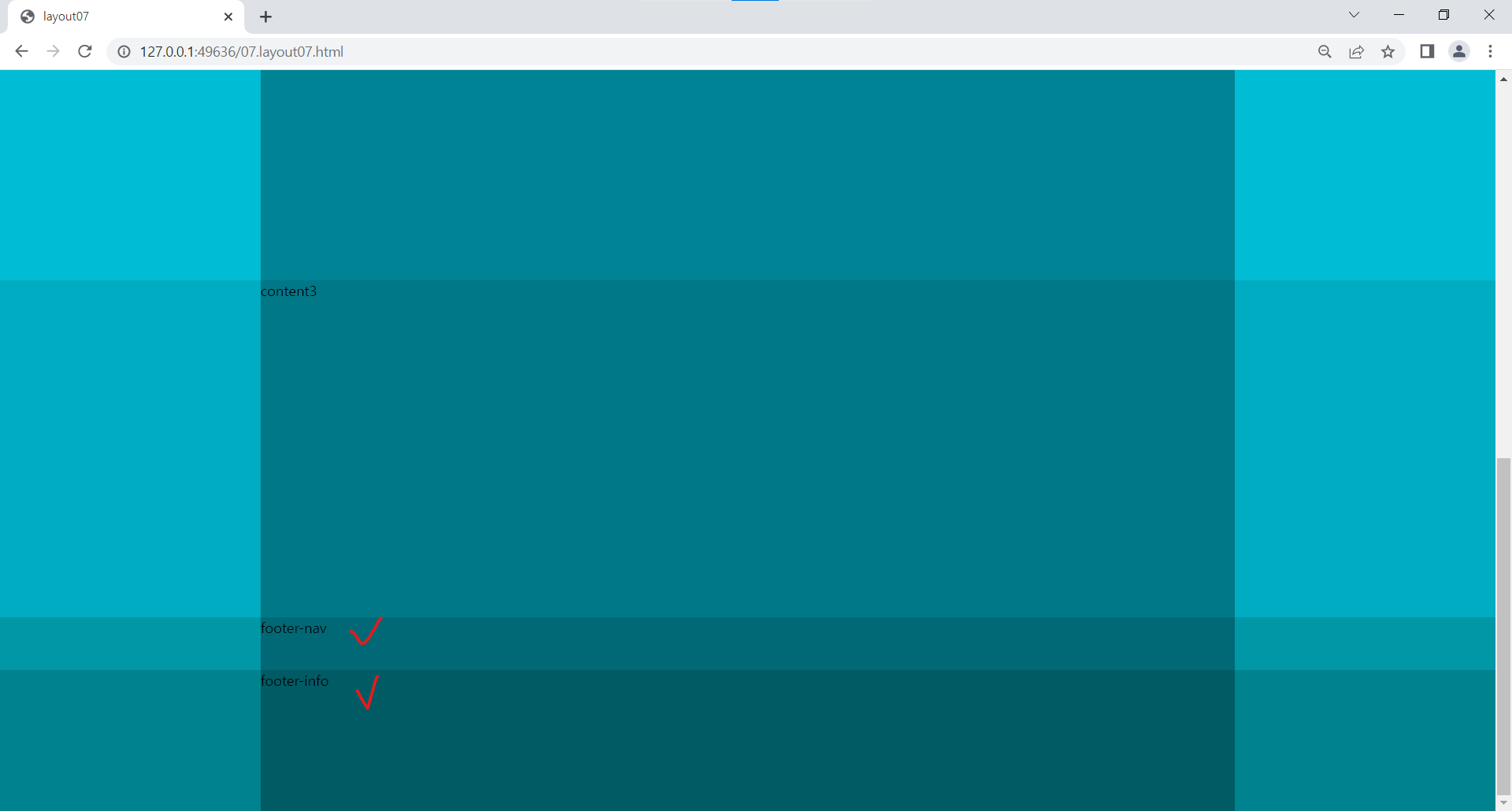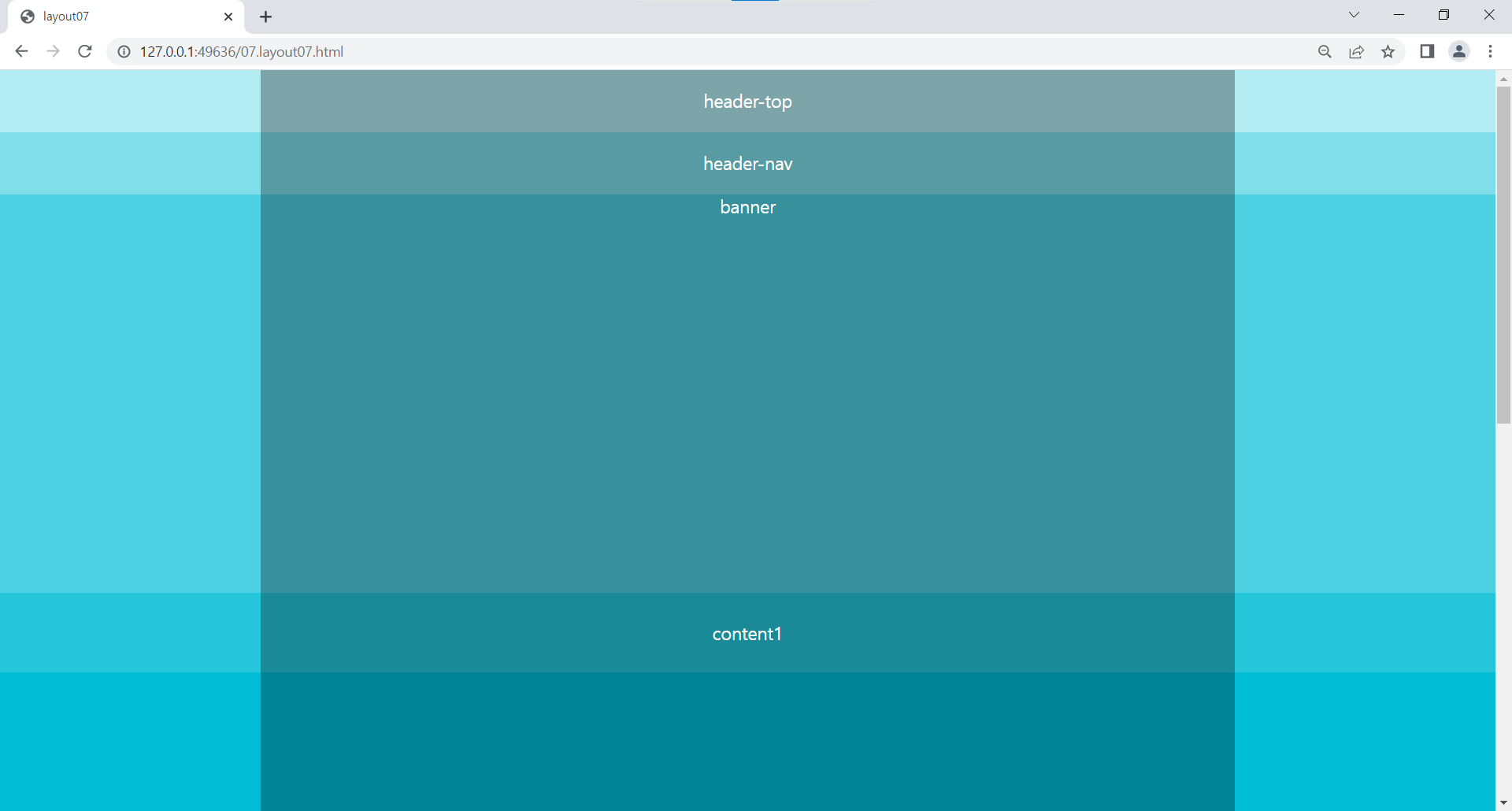 | <!DOCTYPE html> <html lang="ko"> <head> <meta charset="UTF-8"> <title>layout07</title> <style> /* 리셋 */ * {margin: 0; padding: 0;} /* 전체 레이아웃 */ #wrap {font-size: 20px; color: #fff; text-align: center;} #header {height: 140px; } #banner {height: 450px; background: #4dd0e1;} #contents {height: 950px;} #footer {height: 220px;} /* 레이아웃 */ #header-top {height: 70px; line-height: 70px; background: #b2ebf2;} #header-nav {height: 70px; line-height: 70px; background: #80deea;} #content1 {height: 90px; line-height: 90px; background-color: #26c6da;} #content2 {height: 480px; line-height: 480px; background-color: #00bcd4;} #content3 {height: 380px; line-height: 380px; background-color: #00acc1;} #footer-nav {height: 60px; line-height: 60px; background-color: #0097a7;} #footer-info {height: 160px; line-height: 160px; background-color: #00838f;} /* 컨테이너 */ .container {width: 1100px; margin: 0 auto; height: inherit; background: rgba(0,0,0,0.3);} </style> </head> <body> <div id="wrap"> <div id="header"> <div id="header-top"> <div class="container">header-top</div> </div> <div id="header-nav"> <div class="container">header-nav</div> </div> </div> <!-- //header --> <div id="banner"> <div class="container">banner</div> </div> <!-- //banner --> <div id="contents"> <div id="content1"> <div class="container">content1</div> </div> <div id="content2"> <div class="container">content2</div> </div> <div id="content3"> <div class="container">content3</div> </div> </div> <!-- //contents --> <div id="footer"> <div id="footer-nav"> <div class="container">footer-nav</div> </div> <div id="footer-info"> <div class="container">footer-info</div> </div> </div> <!-- //footer --> </div> <!-- //wrap --> </body> </html> |