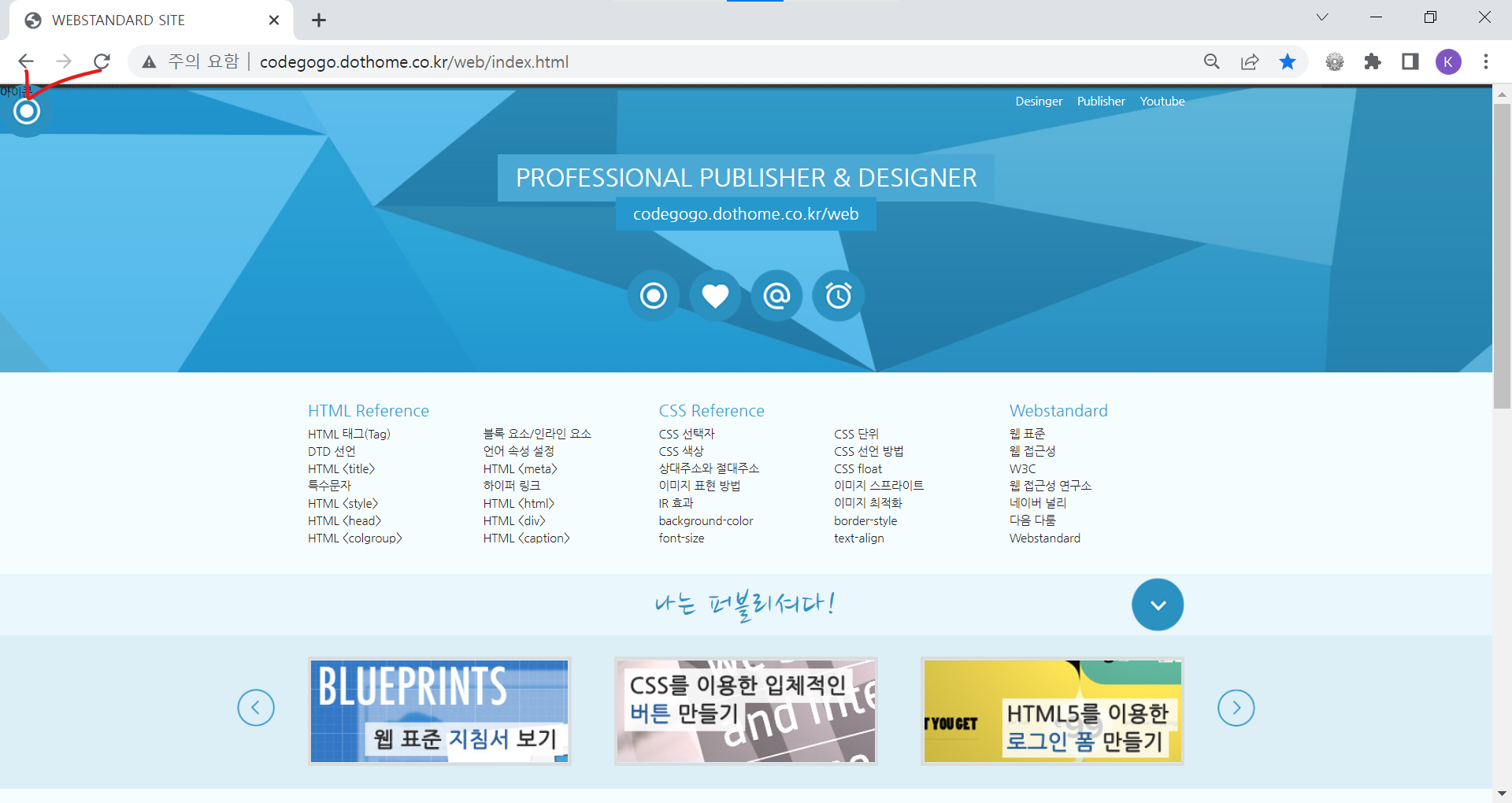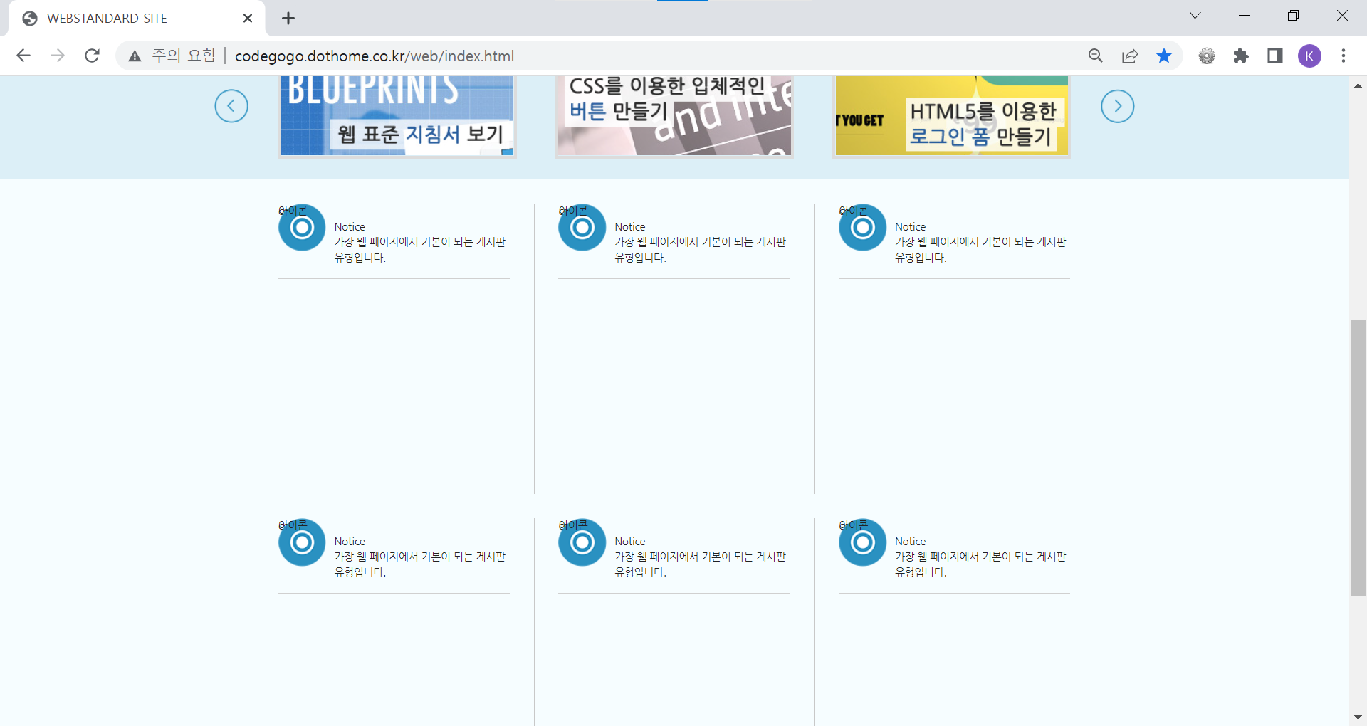 | <!DOCTYPE html> <html lang="ko"> <head> <meta charset="UTF-8"> <meta name="author" content="codegogo"> <meta name="description" content="웹 표준을 준수한 사이트 예제입니다."> <meta name="keywords" content="코드고고, 웹표준, 웹접근성, 사이트 만들기"> <meta name="generator" content="brakets"> <title>WEBSTANDARD SITE</title> <!-- CSS STYLE --> <link rel="stylesheet" type="text/css" href="css/reset.css"> <link rel="stylesheet" href="css/style.css"> <!-- 웹 폰트 --> <link href="https://fonts.googleapis.com/css2?family=Nanum+Gothic&display=swap" rel="stylesheet"> <link href="https://fonts.googleapis.com/css2?family=Nanum+Brush+Script&family=Nanum+Gothic&display=swap" rel="stylesheet"> </head> <body> <!-- 스킵 내비게이션 --> <div id="skip"> <a href="cont_nav">전체 메뉴 바로가기</a> <a href="cont_ban">배너 영역 바로가기</a> <a href="cont_cont">컨텐츠 영역 바로가기</a> </div> <!-- //스킵 내비게이션 --> <div id="wrap"> <div id="header"> <div class="container"> <div class="header"> <div class="header-menu"> <a href="https://codegogo.tistory.com/">Desinger</a> <a href="https://www.inflearn.com/course/%EC%9B%B9-%ED%91%9C%EC%A4%80-%EC%82%AC%EC%9D%B4%ED%8A%B8-%EB%A7%8C%EB%93%A4%EA%B8%B0">Publisher</a> <a href="https://www.youtube.com/">Youtube</a> </div> <!-- //헤더 메뉴 --> <div class="header-tit"> <h1>Professional Publisher & Designer</h1><br> <a href="http://codegogo.dothome.co.kr/web">codegogo.dothome.co.kr/web</a> </div> <!-- //헤더 타이틀 --> <!-- 이미지를 표현하는 방법 1. img 태그로 표현(의미가 있을 때) / alt 태그 - 대체 문자 표현 2. background 속성으로 표현(의미가 없을 때) - 대체 문자 x 3. 이미지를 background 속성 - 웹 표준 준수하기 위해서는 가상으로 대체 문자를 만들어줌(IR 효과) 이미지 스프라이트 효과 --> <div class="header-icon"> <a href="#" class="icon1"><span class="ir_pm">icon1</span></a> <a href="#" class="icon2"><span class="ir_pm">icon2</span></a> <a href="#" class="icon3"><span class="ir_pm">icon3</span></a> <a href="#" class="icon4"><span class="ir_pm">icon4</span></a> </div> <!-- //헤더 아이콘 --> </div> </div> </div> <!-- //header --> <div id="contents"> <div id="cont_nav"> <div class="container"> <h2 class="ir_su">전체 메뉴</h2> <div class="nav"> <div> <h3>HTML Reference</h3> <ol> <li><a href="#">HTML 태그(Tag)</a></li> <li><a href="#">블록 요소/인라인 요소</a></li> <li><a href="#">DTD 선언</a></li> <li><a href="#">언어 속성 설정</a></li> <li><a href="#">HTML <title></a></li> <li><a href="#">HTML <meta></a></li> <li><a href="#">특수문자</a></li> <li><a href="#">하이퍼 링크</a></li> <li><a href="#">HTML <style></a></li> <li><a href="#">HTML <html></a></li> <li><a href="#">HTML <head></a></li> <li><a href="#">HTML <div></a></li> <li><a href="#">HTML <colgroup></a></li> <li><a href="#">HTML <caption></a></li> </ol> </div> <div> <h3>CSS Reference</h3> <ol> <li><a href="#">CSS 선택자</a></li> <li><a href="#">CSS 단위</a></li> <li><a href="#">CSS 색상</a></li> <li><a href="#">CSS 선언 방법</a></li> <li><a href="#">상대주소와 절대주소</a></li> <li><a href="#">CSS float</a></li> <li><a href="#">이미지 표현 방법</a></li> <li><a href="#">이미지 스프라이트</a></li> <li><a href="#">IR 효과</a></li> <li><a href="#">이미지 최적화</a></li> <li><a href="#">background-color</a></li> <li><a href="#">border-style</a></li> <li><a href="#">font-size</a></li> <li><a href="#">text-align</a></li> </ol> </div> <div class="last"> <h3>Webstandard</h3> <ol> <li><a href="#">웹 표준</a></li> <li><a href="#">웹 접근성</a></li> <li><a href="#">W3C</a></li> <li><a href="#">웹 접근성 연구소</a></li> <li><a href="#">네이버 널리</a></li> <li><a href="#">다음 다룸</a></li> <li><a href="#">Webstandard</a></li> </ol> </div> </div> </div> </div> <!-- //cont_nav --> <div id="cont_tit"> <div class="container"> <div class="tit"> <h2>나는 퍼블리셔다!</h2> <a href="#" class="btn"><span class="ir_pm">전체메뉴</span></a> </div> </div> </div> <!-- //cont_tit --> <div id="cont_ban"> <div class="container"> <div class="ban"> <a href="#" class="prev"><span class="ir_pm">이전 이미지</span></a> <ul> <li class="ban_img1"><a href="#"><img src="img/banner_link1.jpg" alt="웹 표준 지침서 보기"></a></li> <li class="ban_img2"><a href="#"><img src="img/banner_link2.jpg" alt="CSS 버튼 만들기"></a></li> <li class="ban_img3"><a href="#"><img src="img/banner_link3.jpg" alt="로그인 폼 만들기"></a></li> </ul> <a href="#" class="next"><span class="ir_pm">다음 이미지</span></a> </div> </div> </div> <!-- //cont_ban --> <div id="cont_cont"> <div class="container"> <div class="cont"> <div class="column col1"> <h3><span class="ico_img ir_pm">아이콘</span><span class="ico_tit">Notice</span></h3> <p class="ico_desc">가장 웹 페이지에서 기본이 되는 게시판 유형입니다.</p> </div> <!-- //col1 --> <div class="column col2"> <h3><span class="ico_img ir_pm">아이콘</span><span class="ico_tit">Notice</span></h3> <p class="ico_desc">가장 웹 페이지에서 기본이 되는 게시판 유형입니다.</p> </div> <!-- //col2 --> <div class="column col3"> <h3><span class="ico_img ir_pm">아이콘</span><span class="ico_tit">Notice</span></h3> <p class="ico_desc">가장 웹 페이지에서 기본이 되는 게시판 유형입니다.</p> </div> <!-- //col3 --> <div class="column col4"> <h3><span class="ico_img ir_pm">아이콘</span><span class="ico_tit">Notice</span></h3> <p class="ico_desc">가장 웹 페이지에서 기본이 되는 게시판 유형입니다.</p> </div> <!-- //col4 --> <div class="column col5"> <h3><span class="ico_img ir_pm">아이콘</span><span class="ico_tit">Notice</span></h3> <p class="ico_desc">가장 웹 페이지에서 기본이 되는 게시판 유형입니다.</p> </div> <!-- //col5 --> <div class="colu