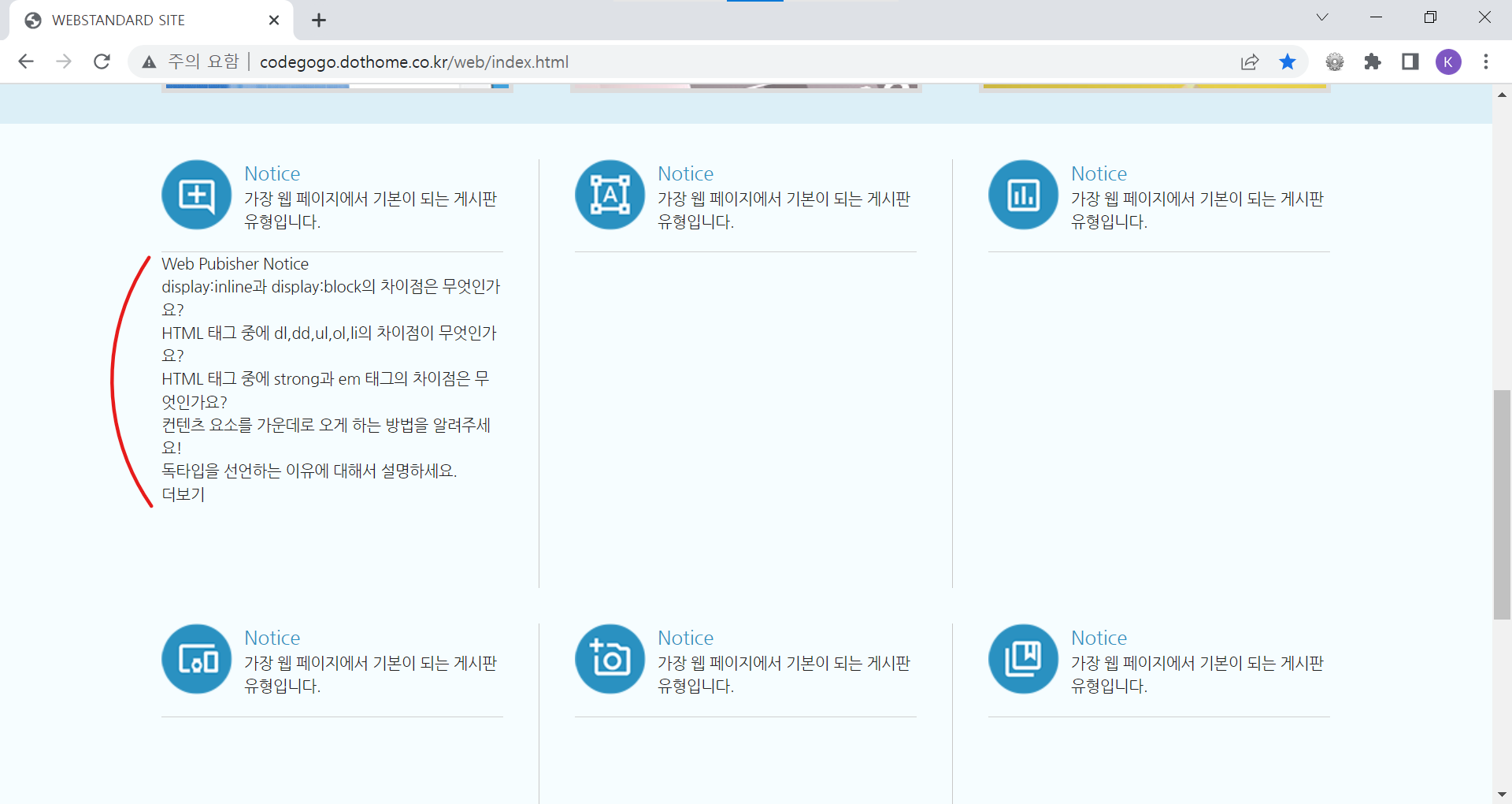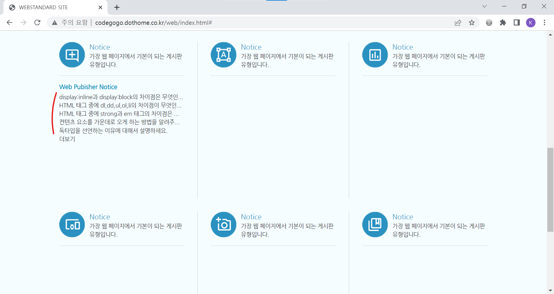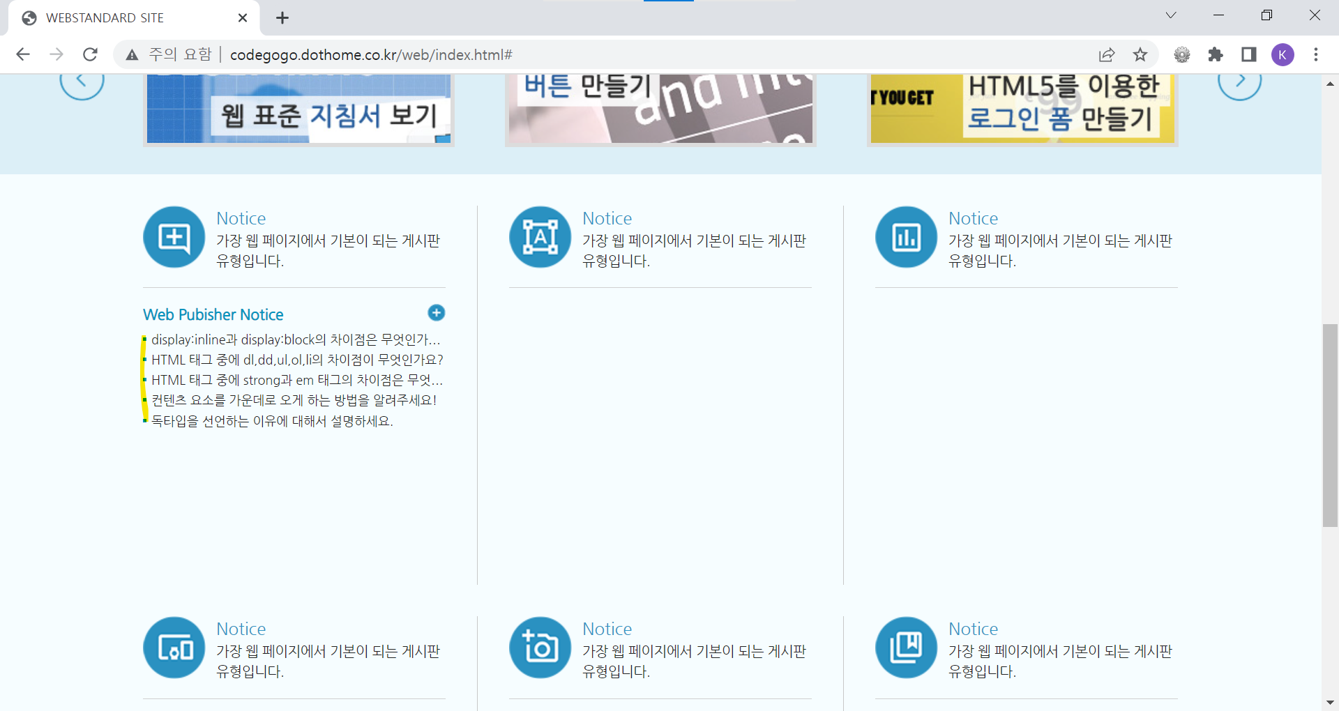 | <!DOCTYPE html> <html lang="ko"> <head> <meta charset="UTF-8"> <meta name="author" content="codegogo"> <meta name="description" content="웹 표준을 준수한 사이트 예제입니다."> <meta name="keywords" content="코드고고, 웹표준, 웹접근성, 사이트 만들기"> <meta name="generator" content="brakets"> <title>WEBSTANDARD SITE</title> <!-- CSS STYLE --> <link rel="stylesheet" type="text/css" href="css/reset.css"> <link rel="stylesheet" href="css/style.css"> <!-- 웹 폰트 --> <link href="https://fonts.googleapis.com/css2?family=Nanum+Gothic&display=swap" rel="stylesheet"> <link href="https://fonts.googleapis.com/css2?family=Nanum+Brush+Script&family=Nanum+Gothic&display=swap" rel="stylesheet"> </head> <body> <!-- 스킵 내비게이션 --> <div id="skip"> <a href="cont_nav">전체 메뉴 바로가기</a> <a href="cont_ban">배너 영역 바로가기</a> <a href="cont_cont">컨텐츠 영역 바로가기</a> </div> <!-- //스킵 내비게이션 --> <div id="wrap"> <div id="header"> <div class="container"> <div class="header"> <div class="header-menu"> <a href="https://codegogo.tistory.com/">Desinger</a> <a href="https://www.inflearn.com/course/%EC%9B%B9-%ED%91%9C%EC%A4%80-%EC%82%AC%EC%9D%B4%ED%8A%B8-%EB%A7%8C%EB%93%A4%EA%B8%B0">Publisher</a> <a href="https://www.youtube.com/">Youtube</a> </div> <!-- //헤더 메뉴 --> <div class="header-tit"> <h1>Professional Publisher & Designer</h1><br> <a href="http://codegogo.dothome.co.kr/web">codegogo.dothome.co.kr/web</a> </div> <!-- //헤더 타이틀 --> <!-- 이미지를 표현하는 방법 1. img 태그로 표현(의미가 있을 때) / alt 태그 - 대체 문자 표현 2. background 속성으로 표현(의미가 없을 때) - 대체 문자 x 3. 이미지를 background 속성 - 웹 표준 준수하기 위해서는 가상으로 대체 문자를 만들어줌(IR 효과) 이미지 스프라이트 효과 --> <div class="header-icon"> <a href="#" class="icon1"><span class="ir_pm">icon1</span></a> <a href="#" class="icon2"><span class="ir_pm">icon2</span></a> <a href="#" class="icon3"><span class="ir_pm">icon3</span></a> <a href="#" class="icon4"><span class="ir_pm">icon4</span></a> </div> <!-- //헤더 아이콘 --> </div> </div> </div> <!-- //header --> <div id="contents"> <div id="cont_nav"> <div class="container"> <h2 class="ir_su">전체 메뉴</h2> <div class="nav"> <div> <h3>HTML Reference</h3> <ol> <li><a href="#">HTML 태그(Tag)</a></li> <li><a href="#">블록 요소/인라인 요소</a></li> <li><a href="#">DTD 선언</a></li> <li><a href="#">언어 속성 설정</a></li> <li><a href="#">HTML <title></a></li> <li><a href="#">HTML <meta></a></li> <li><a href="#">특수문자</a></li> <li><a href="#">하이퍼 링크</a></li> <li><a href="#">HTML <style></a></li> <li><a href="#">HTML <html></a></li> <li><a href="#">HTML <head></a></li> <li><a href="#">HTML <div></a></li> <li><a href="#">HTML <colgroup></a></li> <li><a href="#">HTML <caption></a></li> </ol> </div> <div> <h3>CSS Reference</h3> <ol> <li><a href="#">CSS 선택자</a></li> <li><a href="#">CSS 단위</a></li> <li><a href="#">CSS 색상</a></li> <li><a href="#">CSS 선언 방법</a></li> <li><a href="#">상대주소와 절대주소</a></li> <li><a href="#">CSS float</a></li> <li><a href="#">이미지 표현 방법</a></li> <li><a href="#">이미지 스프라이트</a></li> <li><a href="#">IR 효과</a></li> <li><a href="#">이미지 최적화</a></li> <li><a href="#">background-color</a></li> <li><a href="#">border-style</a></li> <li><a href="#">font-size</a></li> <li><a href="#">text-align</a></li> </ol> </div> <div class="last"> <h3>Webstandard</h3> <ol> <li><a href="#">웹 표준</a></li> <li><a href="#">웹 접근성</a></li> <li><a href="#">W3C</a></li> <li><a href="#">웹 접근성 연구소</a></li> <li><a href="#">네이버 널리</a></li> <li><a href="#">다음 다룸</a></li> <li><a href="#">Webstandard</a></li> </ol> </div> </div> </div> </div> <!-- //cont_nav --> <div id="cont_tit"> <div class="container"> <div class="tit"> <h2>나는 퍼블리셔다!</h2> <a href="#" class="btn"><span class="ir_pm">전체메뉴</span></a> </div> </div> </div> <!-- //cont_tit --> <div id="cont_ban"> <div class="container"> <div class="ban"> <a href="#" class="prev"><span class="ir_pm">이전 이미지</span></a> <ul> <li class="ban_img1"><a href="#"><img src="img/banner_link1.jpg" alt="웹 표준 지침서 보기"></a></li> <li class="ban_img2"><a href="#"><img src="img/banner_link2.jpg" alt="CSS 버튼 만들기"></a></li> <li class="ban_img3"><a href="#"><img src="img/banner_link3.jpg" alt="로그인 폼 만들기"></a></li> </ul> <a href="#" class="next"><span class="ir_pm">다음 이미지</span></a> </div> </div> </div> <!-- //cont_ban --> <div id="cont_cont"> <div class="container"> <div class="cont"> <div class="column col1"> <h3><span class="ico_img ir_pm">아이콘</span><span class="ico_tit">Notice</span></h3> <p class="ico_desc">가장 웹 페이지에서 기본이 되는 게시판 유형입니다.</p> <!-- 게시판 --> <div class="notice"> <h4>Web Pubisher Notice</h4> <ul> <li><a href="#">display:inline과 display:block의 차이점은 무엇인가요?</a></li> <li><a href="#">HTML 태그 중에 dl,dd,ul,ol,li의 차이점이 무엇인가요?</a></li> <li><a href="#">HTML 태그 중에 strong과 em 태그의 차이점은 무엇인가요?</a></li> <li><a href="#">컨텐츠 요소를 가운데로 오게 하는 방법을 알려주세요!</a></li> <li><a href="#">독타입을 선언하는 이유에 대해서 설명하세요.</a></li> </ul> <a href="#" class="more ir_pm" title="더보기">더보기</a> </div> <!-- //게시판--> </div> <!-- //col1 --> <div class="column col2"> <h3><span class="ico_img ir_pm">아이콘</span><span class="ico_tit">Notice</span></h3> <p class="ico_desc">가장 웹 페이지에서 기본이 되는 게시판 유형입니다.</p> </div> <!-- //col2 --> <div class="column col3"> <h3><span class="ico_img ir_pm">아이콘</span><span