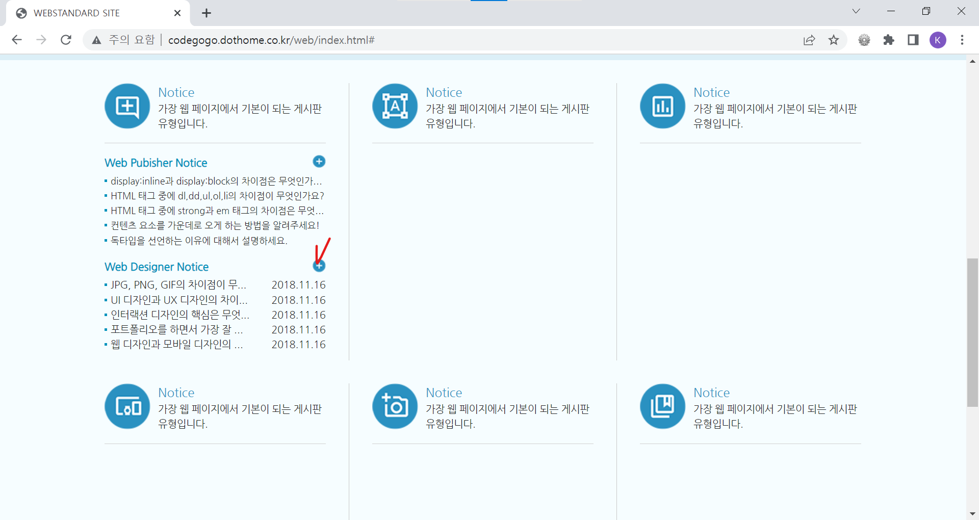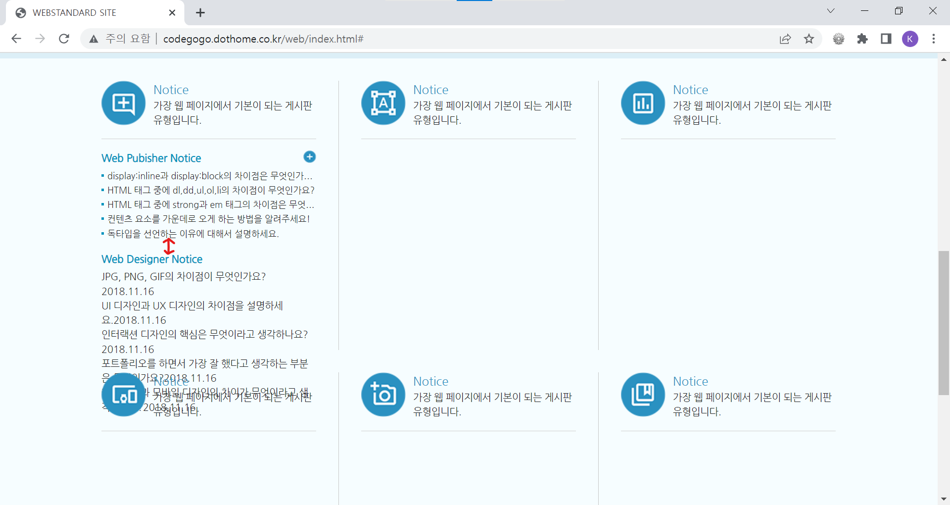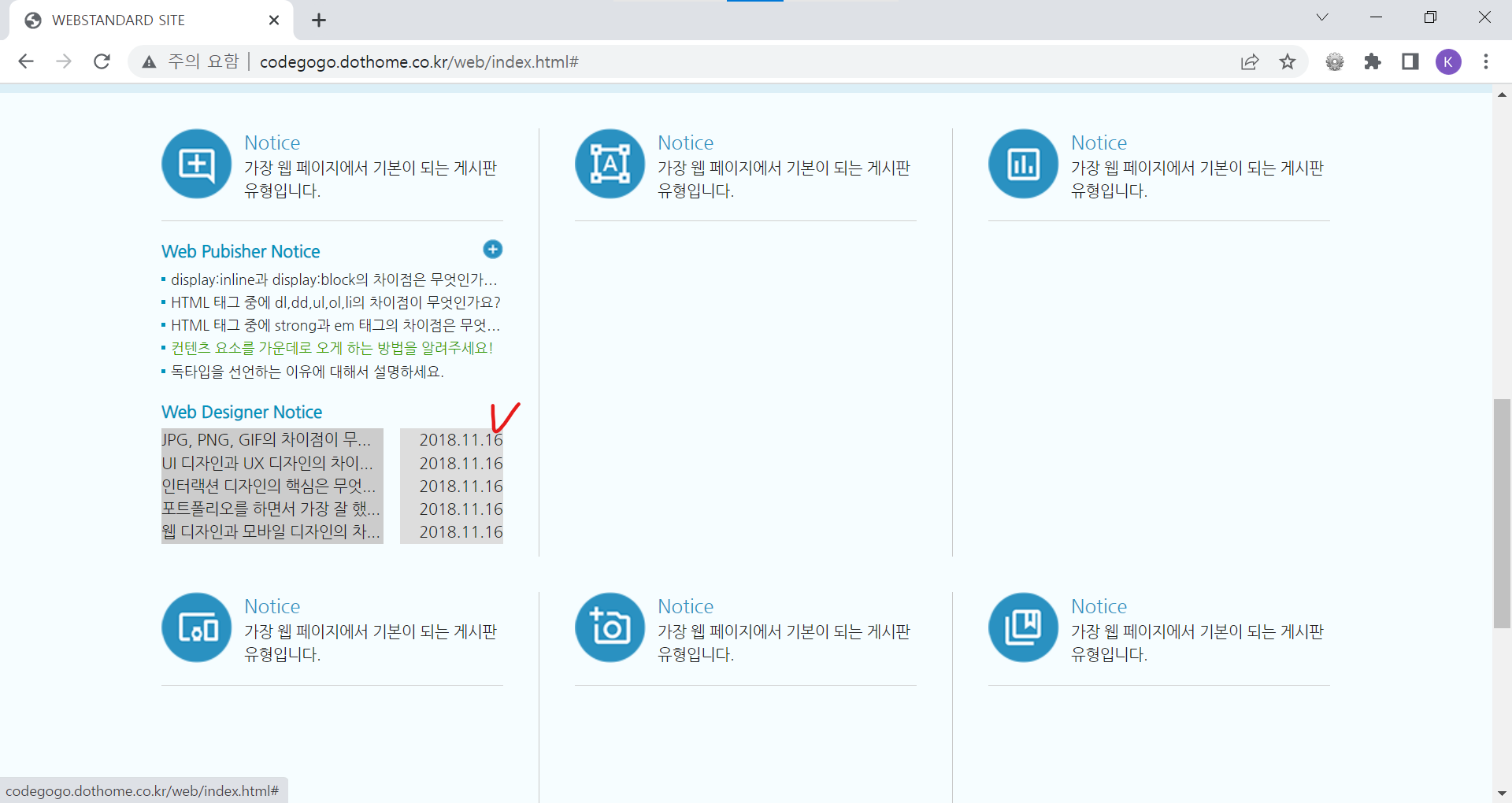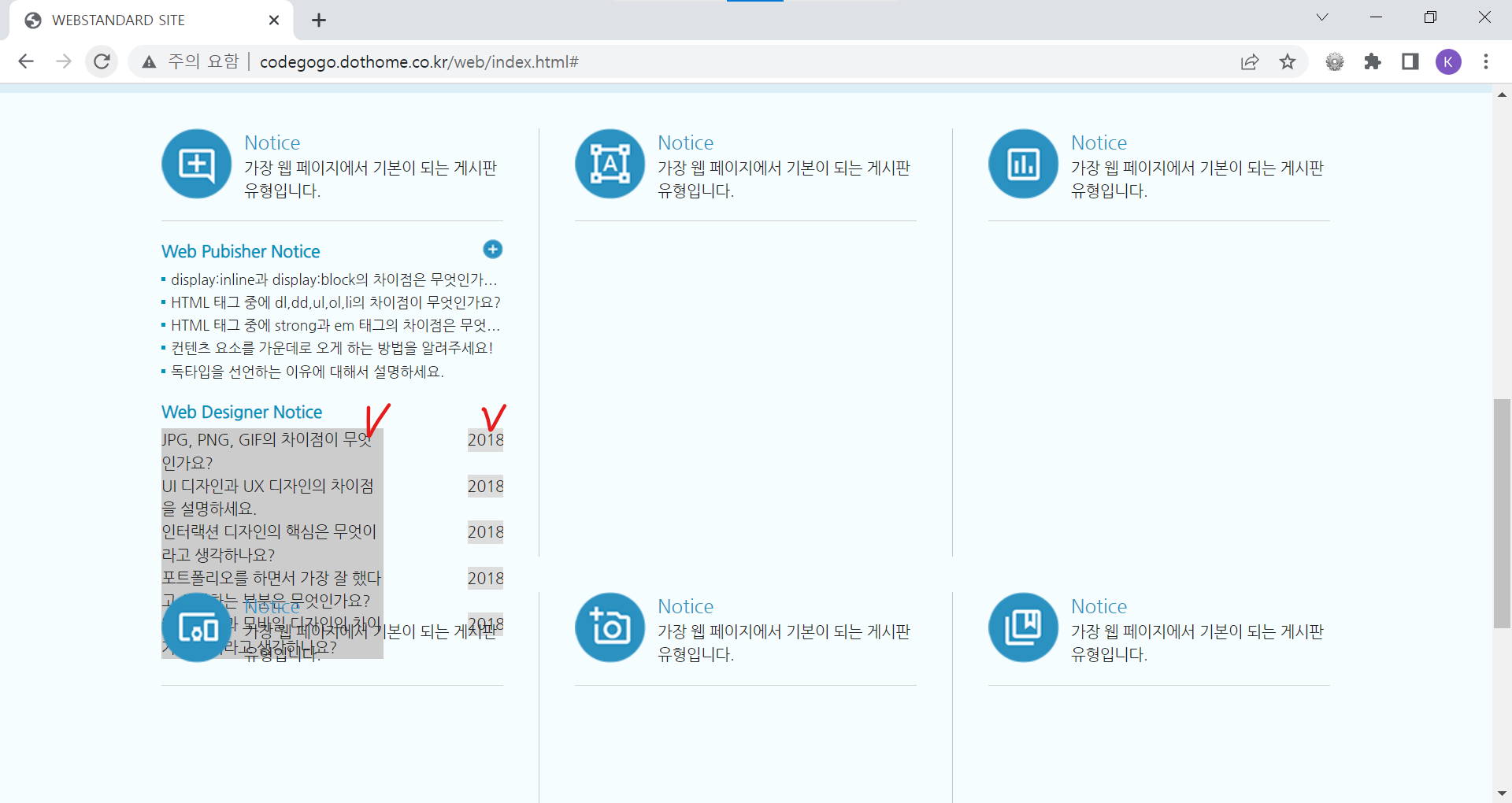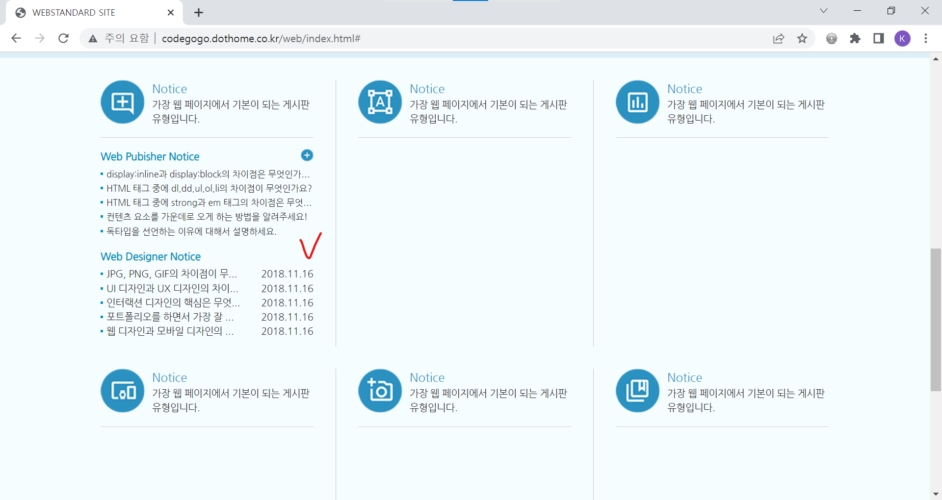 | <!DOCTYPE html> <html lang="ko"> <head> <meta charset="UTF-8"> <meta name="author" content="codegogo"> <meta name="description" content="웹 표준을 준수한 사이트 예제입니다."> <meta name="keywords" content="코드고고, 웹표준, 웹접근성, 사이트 만들기"> <meta name="generator" content="brakets"> <title>WEBSTANDARD SITE</title> <!-- CSS STYLE --> <link rel="stylesheet" type="text/css" href="css/reset.css"> <link rel="stylesheet" href="css/style.css"> <!-- 웹 폰트 --> <link href="https://fonts.googleapis.com/css2?family=Nanum+Gothic&display=swap" rel="stylesheet"> <link href="https://fonts.googleapis.com/css2?family=Nanum+Brush+Script&family=Nanum+Gothic&display=swap" rel="stylesheet"> </head> <body> <!-- 스킵 내비게이션 --> <div id="skip"> <a href="cont_nav">전체 메뉴 바로가기</a> <a href="cont_ban">배너 영역 바로가기</a> <a href="cont_cont">컨텐츠 영역 바로가기</a> </div> <!-- //스킵 내비게이션 --> <div id="wrap"> <div id="header"> <div class="container"> <div class="header"> <div class="header-menu"> <a href="https://codegogo.tistory.com/">Desinger</a> <a href="https://www.inflearn.com/course/%EC%9B%B9-%ED%91%9C%EC%A4%80-%EC%82%AC%EC%9D%B4%ED%8A%B8-%EB%A7%8C%EB%93%A4%EA%B8%B0">Publisher</a> <a href="https://www.youtube.com/">Youtube</a> </div> <!-- //헤더 메뉴 --> <div class="header-tit"> <h1>Professional Publisher & Designer</h1><br> <a href="http://codegogo.dothome.co.kr/web">codegogo.dothome.co.kr/web</a> </div> <!-- //헤더 타이틀 --> <!-- 이미지를 표현하는 방법 1. img 태그로 표현(의미가 있을 때) / alt 태그 - 대체 문자 표현 2. background 속성으로 표현(의미가 없을 때) - 대체 문자 x 3. 이미지를 background 속성 - 웹 표준 준수하기 위해서는 가상으로 대체 문자를 만들어줌(IR 효과) 이미지 스프라이트 효과 --> <div class="header-icon"> <a href="#" class="icon1"><span class="ir_pm">icon1</span></a> <a href="#" class="icon2"><span class="ir_pm">icon2</span></a> <a href="#" class="icon3"><span class="ir_pm">icon3</span></a> <a href="#" class="icon4"><span class="ir_pm">icon4</span></a> </div> <!-- //헤더 아이콘 --> </div> </div> </div> <!-- //header --> <div id="contents"> <div id="cont_nav"> <div class="container"> <h2 class="ir_su">전체 메뉴</h2> <div class="nav"> <div> <h3>HTML Reference</h3> <ol> <li><a href="#">HTML 태그(Tag)</a></li> <li><a href="#">블록 요소/인라인 요소</a></li> <li><a href="#">DTD 선언</a></li> <li><a href="#">언어 속성 설정</a></li> <li><a href="#">HTML <title></a></li> <li><a href="#">HTML <meta></a></li> <li><a href="#">특수문자</a></li> <li><a href="#">하이퍼 링크</a></li> <li><a href="#">HTML <style></a></li> <li><a href="#">HTML <html></a></li> <li><a href="#">HTML <head></a></li> <li><a href="#">HTML <div></a></li> <li><a href="#">HTML <colgroup></a></li> <li><a href="#">HTML <caption></a></li> </ol> </div> <div> <h3>CSS Reference</h3> <ol> <li><a href="#">CSS 선택자</a></li> <li><a href="#">CSS 단위</a></li> <li><a href="#">CSS 색상</a></li> <li><a href="#">CSS 선언 방법</a></li> <li><a href="#">상대주소와 절대주소</a></li> <li><a href="#">CSS float</a></li> <li><a href="#">이미지 표현 방법</a></li> <li><a href="#">이미지 스프라이트</a></li> <li><a href="#">IR 효과</a></li> <li><a href="#">이미지 최적화</a></li> <li><a href="#">background-color</a></li> <li><a href="#">border-style</a></li> <li><a href="#">font-size</a></li> <li><a href="#">text-align</a></li> </ol> </div> <div class="last"> <h3>Webstandard</h3> <ol> <li><a href="#">웹 표준</a></li> <li><a href="#">웹 접근성</a></li> <li><a href="#">W3C</a></li> <li><a href="#">웹 접근성 연구소</a></li> <li><a href="#">네이버 널리</a></li> <li><a href="#">다음 다룸</a></li> <li><a href="#">Webstandard</a></li> </ol> </div> </div> </div> </div> <!-- //cont_nav --> <div id="cont_tit"> <div class="container"> <div class="tit"> <h2>나는 퍼블리셔다!</h2> <a href="#" class="btn"><span class="ir_pm">전체메뉴</span></a> </div> </div> </div> <!-- //cont_tit --> <div id="cont_ban"> <div class="container"> <div class="ban"> <a href="#" class="prev"><span class="ir_pm">이전 이미지</span></a> <ul> <li class="ban_img1"><a href="#"><img src="img/banner_link1.jpg" alt="웹 표준 지침서 보기"></a></li> <li class="ban_img2"><a href="#"><img src="img/banner_link2.jpg" alt="CSS 버튼 만들기"></a></li> <li class="ban_img3"><a href="#"><img src="img/banner_link3.jpg" alt="로그인 폼 만들기"></a></li> </ul> <a href="#" class="next"><span class="ir_pm">다음 이미지</span></a> </div> </div> </div> <!-- //cont_ban --> <div id="cont_cont"> <div class="container"> <div class="cont"> <div class="column col1"> <h3><span class="ico_img ir_pm">아이콘</span><span class="ico_tit">Notice</span></h3> <p class="ico_desc">가장 웹 페이지에서 기본이 되는 게시판 유형입니다.</p> <!-- 게시판 --> <div class="notice"> <h4>Web Pubisher Notice</h4> <ul> <li><a href="#">display:inline과 display:block의 차이점은 무엇인가요?</a></li> <li><a href="#">HTML 태그 중에 dl,dd,ul,ol,li의 차이점이 무엇인가요?</a></li> <li><a href="#">HTML 태그 중에 strong과 em 태그의 차이점은 무엇인가요?</a></li> <li><a href="#">컨텐츠 요소를 가운데로 오게 하는 방법을 알려주세요!</a></li> <li><a href="#">독타입을 선언하는 이유에 대해서 설명하세요.</a></li> </ul> <a href="#" class="more ir_pm" title="더보기">더보기</a> </div> <!-- //게시판--> <!-- 게시판2 --> <div class="notice2"> <h4>Web Designer Notice</h4> <ul> <li><a href="#">JPG, PNG, GIF의 차이점이 무엇인가요?</a><span>2018.11.16</span></li> <li><a href="#">UI 디자인과 UX 디자인의 차이점을 설명하세요.</a><span>2018.11.16</span></li> <li><a href="#">인터랙션 디자인의 핵심은 