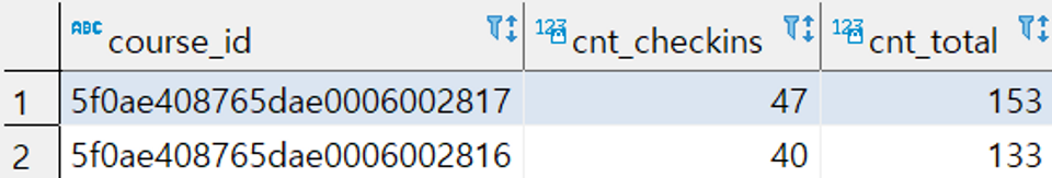 select a.course_id, b.cnt_checkins, a.cnt_total from