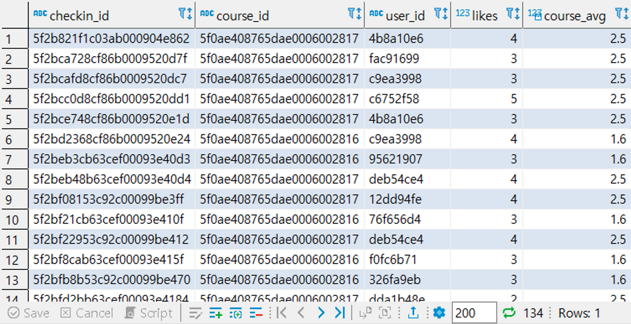 ☞예시) checkins 테이블에 course_id별 평균 likes수 필드 우측에 붙여보기