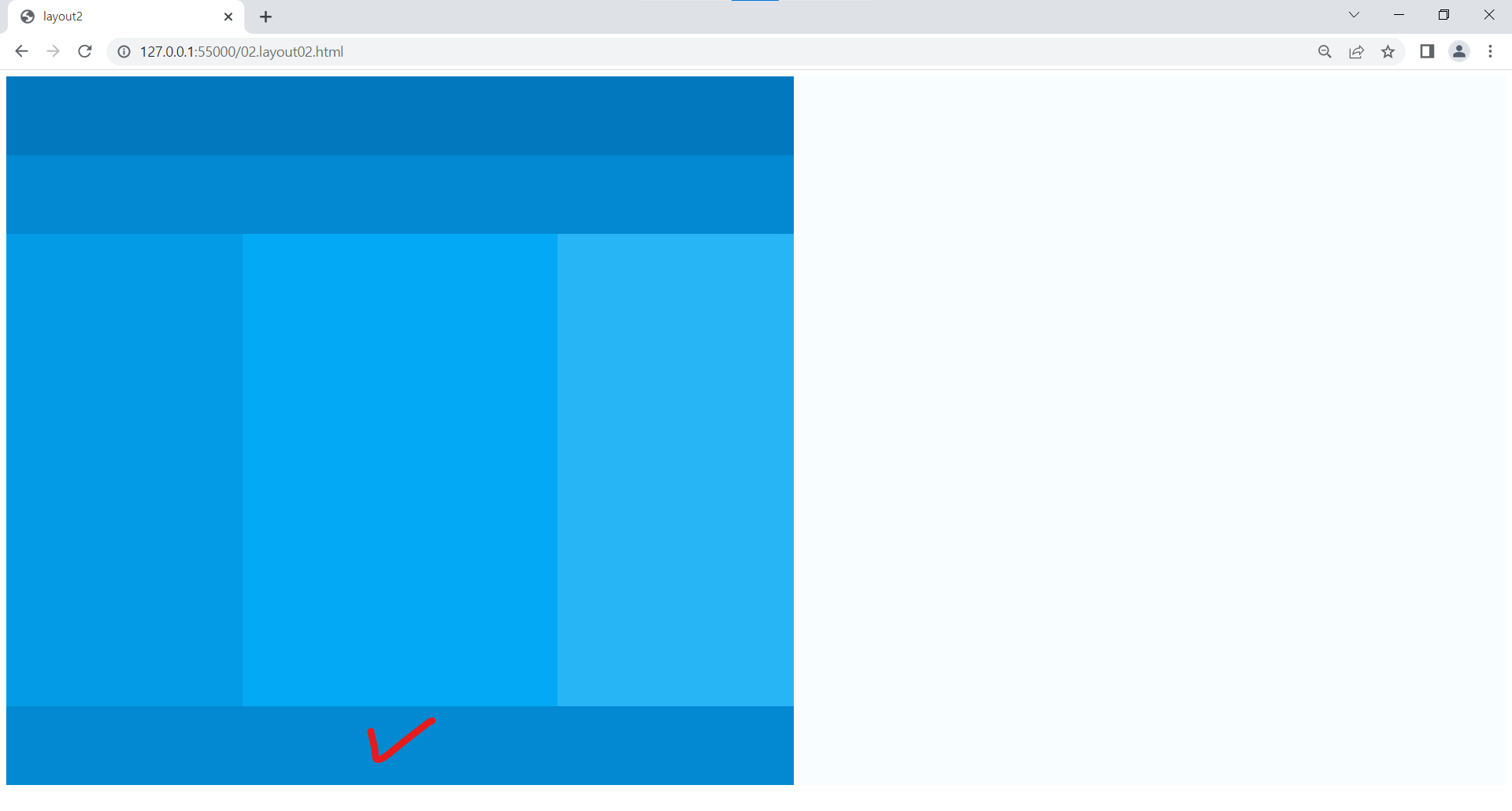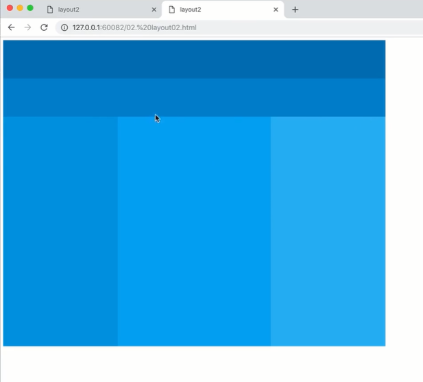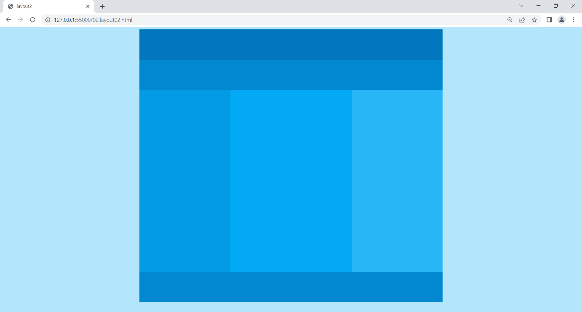 | <!DOCTYPE html> <html lang="ko"> <head> <meta charset="UTF-8"> <title>layout2</title> <style> body {background: #b3e5fc;} #wrap {width: 1000px; height: 900px; margin: 0 auto; font-size: 40px; color:#fff; text-align: center; text-transform: uppercase;} #header {width: 1000px; height: 100px; line-height: 100px; background-color: #0277bd;} #nav {width: 1000px; height: 100px; line-height: 100px; background-color: #0288d1;} #side_left {float: left; width: 300px; height: 600px; line-height: 600px; background-color: #039be5;} #contents {float: left; width: 400px; height: 600px; line-height: 600px; background-color: #03a9f4;} #side_right {float: left; width: 300px; height: 600px; line-height: 600px; background-color: #29b6f6;} #footer {clear: both; width: 1000px; height: 100px; line-height: 100px; background-color: #0288d1;} </style> </head> <body> <div id="wrap"> <div id="header">header</div> <div id="nav">nav</div> <div id="side_left">side_left</div> <div id="contents">contents</div> <div id="side_right">side_right</div> <div id="footer">footer</div> </div> </body> </html> |